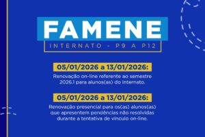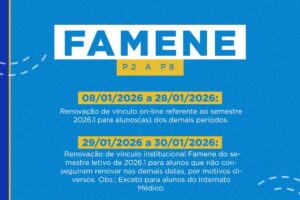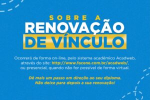 Conforme datas abaixo, a renovação do vínculo para o semestre letivo 2026.1 ocorrerá de forma on-line pelo sistema acadêmico Acadweb, através do site: https://www.facene.com.br/acadweb/, ou de forma presencial, quando não for possível de forma virtual.