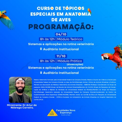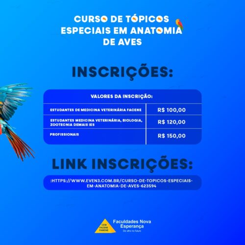 A Coordenação do Curso de Medicina Veterinária, em parceria com o NUPEA, promovem nos dias 04 e 11 de outubro de 2025 o Curso de Tópicos Especiais em Anatomia de Aves.
